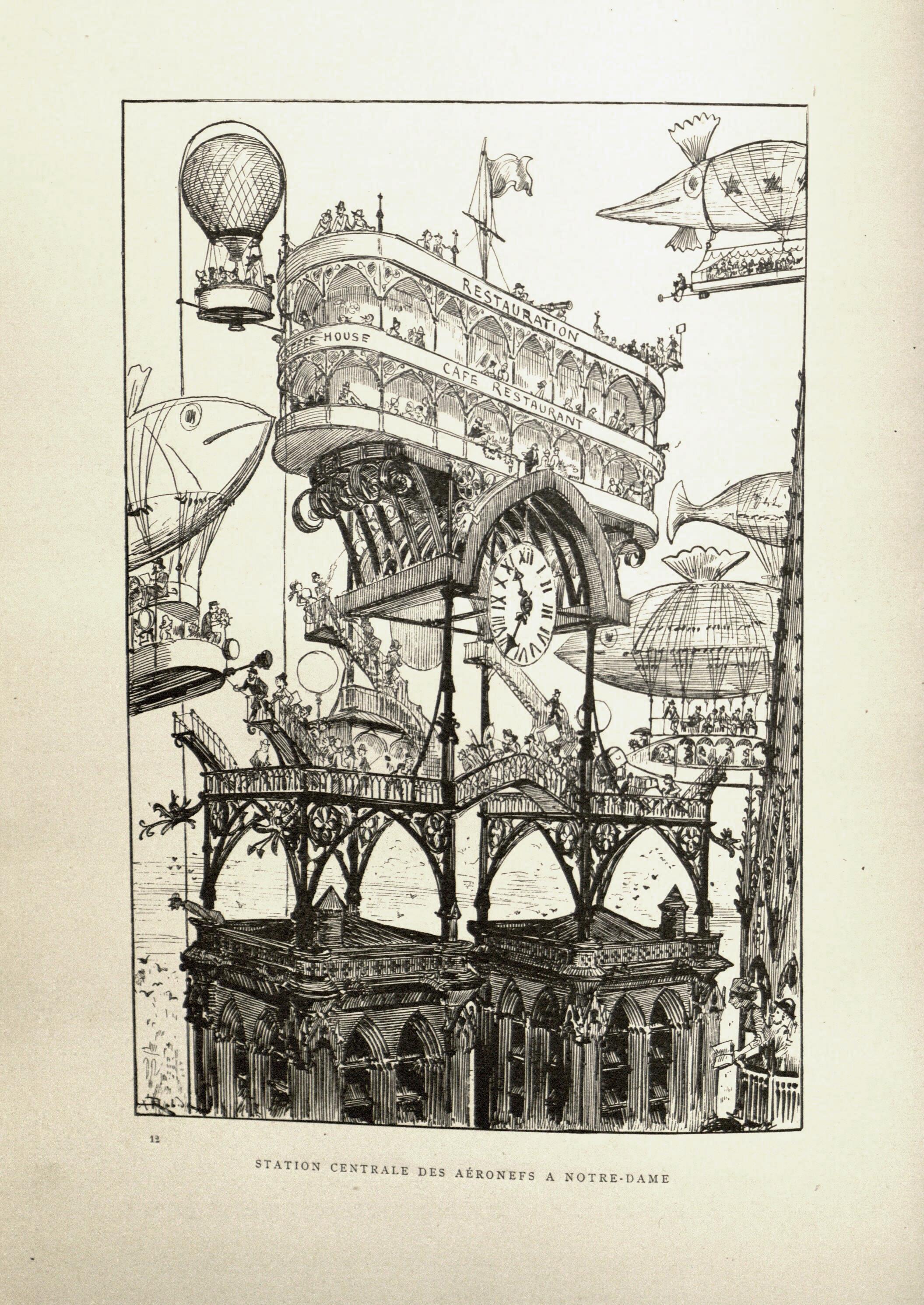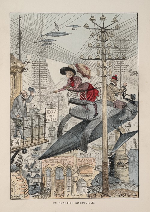Il primo nucleo di sguardi appartiene a illustratori e architetti che, tra Ottocento e primo Novecento, hanno trasformato l’ipotesi in immagine. Jean-Marc Côté, con le sue carte En L’An 2000, proiettava scuole elettrificate, mezzi volanti, mestieri impossibili: un lessico visivo che ancora oggi sembra familiare. Albert Robida, con Le Vingtième Siècle, descriveva con precisione sorprendente videotelefonia, tele-lavoro e città verticali; Luigi Russolo, inventando gli intonarumori, ascoltava già la musica industriale del futuro; Antonio Sant’Elia immaginava la città come infrastruttura continua, fatta di ascensori esterni, ponti multilivello, grattacieli sovrapposti. In tutti, l’idea che il futuro non sia un salto, ma una linea retta che si prolunga dal presente.